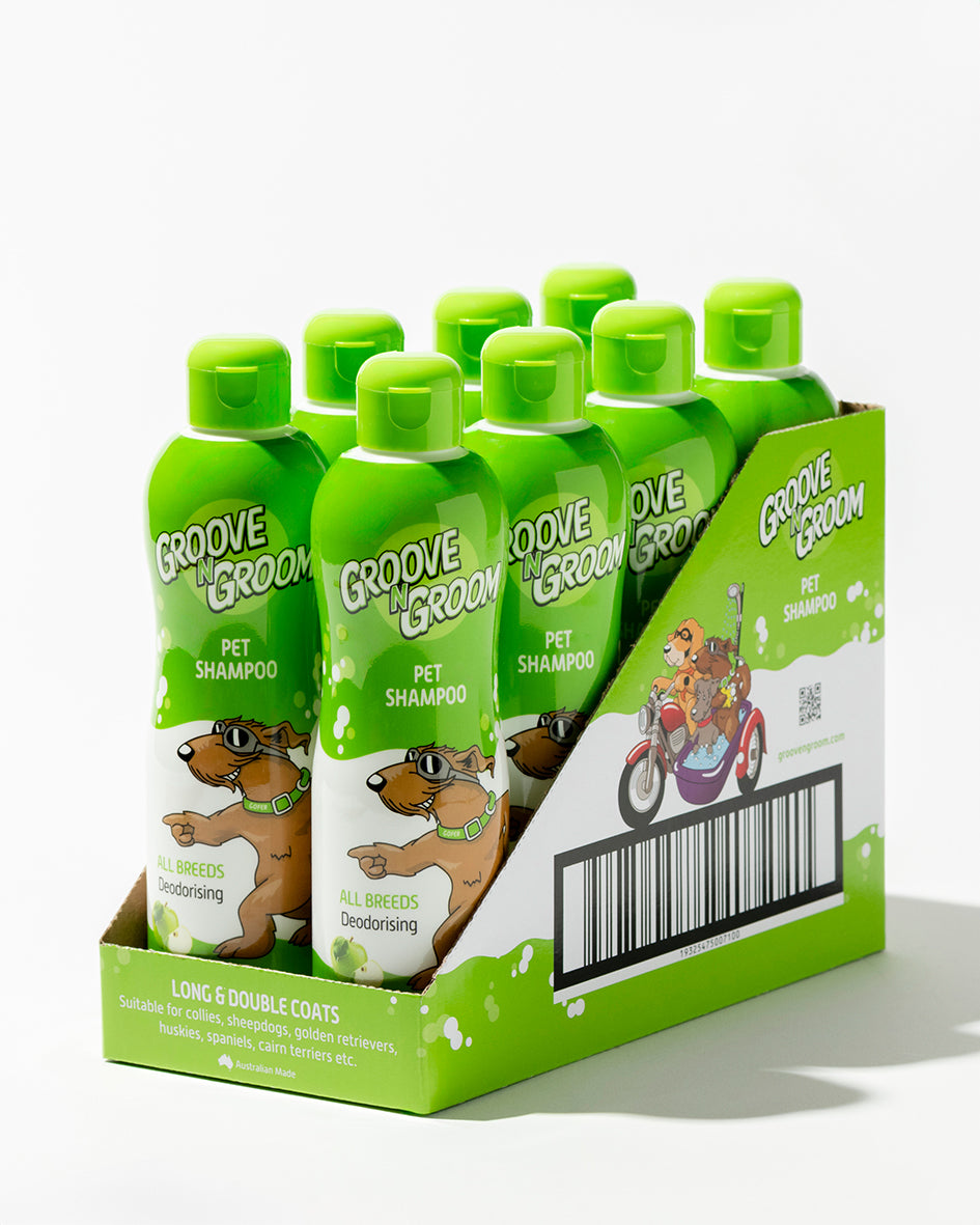 GROOVE N GROOM shampoo washes away dirt and odours, thoroughly cleaning your dog’s coat. Perfect for all shapes and sizes.