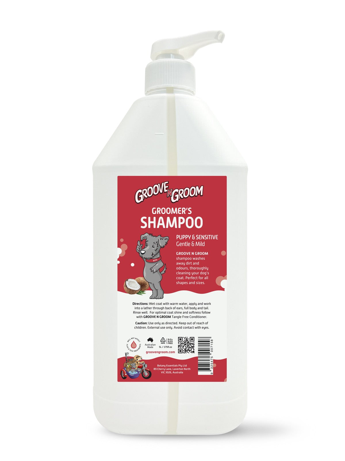 Directions: Wet coat with warm water, apply and work into a lather through back of ears, full body and tail. Rinse well. For optimal coat shine and softness follow with GROOVE N GROOM Tangle Free Conditioner.